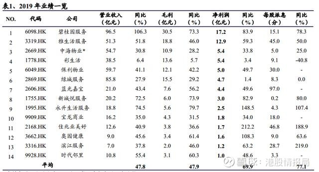 2019年14家主要物管公司的營業收入、毛利、淨利潤以及每股派息的平均增速分別為47.8%、47.9%、69.9%和77.1%。
