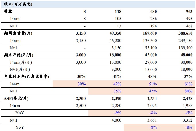 2)收入分拆:根據規劃14nm與10nm最終產能合計約7萬片,假設每季度產能爬坡約3千片;14nmASP初始為2500美元/片,10nmASP初始為4000m美元每片;產能利用率在23年達到80%的水平(考慮良率);