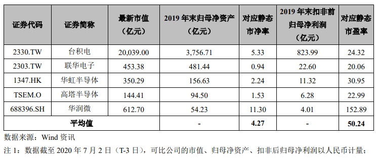 事實上,中芯在招股文件與其他行業公司對比估值時,亦有以PB作比較(見下圖),而市場龍頭台積電PB已逾5倍。不過,要留意中芯經過周一升勢後,現時PB也已達5倍。