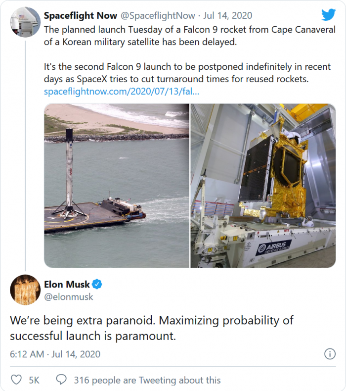 那麼為什麼這一切會同時發生呢?埃隆·馬斯克決定在Twitter上簡要地介紹一下公司的思路。他在Twitter上發文稱:“我們變得格外偏執。最大限度地提高發射成功的可能性是最重要的。”雖然這條推文是對一則有關韓國衛星發射延遲的新聞鏈接的回應,但這條推文似乎也適用於其他被推遲的任務。