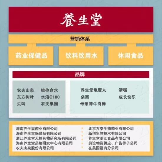 養生堂是一家專注於大健康領域的投資性公司,其控股的企業及生產的產品涉及飲用水及飲料、診斷試劑及疫苗、保健品及健康食品、化妝品、種植及房地產等多個行業。除了“農夫山泉”之外,“養生堂龜鱉丸”“朵而”“清嘴”“成長快樂”“母親牌牛肉棒”均在各自的細分領域獨領風騷。