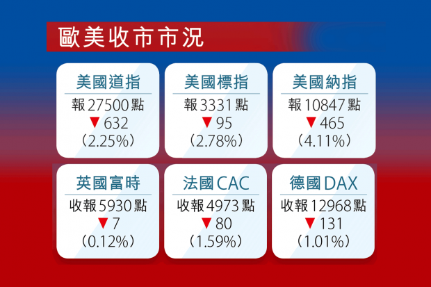 美市收市,道指跌632點或2.25%,為連續第三個交易日下滑。標指及納指分別挫2.78%及4.11%;其中,納指過去三個交易日的累積跌幅達到一成,為8月以來最大的連續三日累積跌幅,標指三日累積都挫近7%。