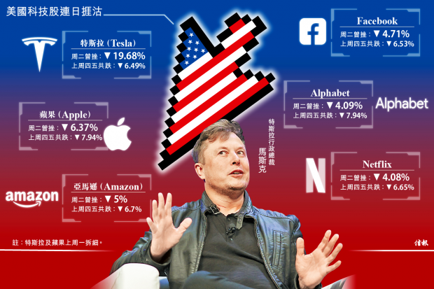 美國大型科技股承接上周跌勢,在周二假期後復市繼續走低,拖累美股全面下滑,尤其是電動車生產商特斯拉(Tesla)出乎意料未能躋身標普指數,股價急瀉逾兩成。納指應聲急插,曾挫4.2%,失守11000關,較年內高位低11.41%,墮入技術調整區。道指曾跌668點,標指一度挫2.85%。