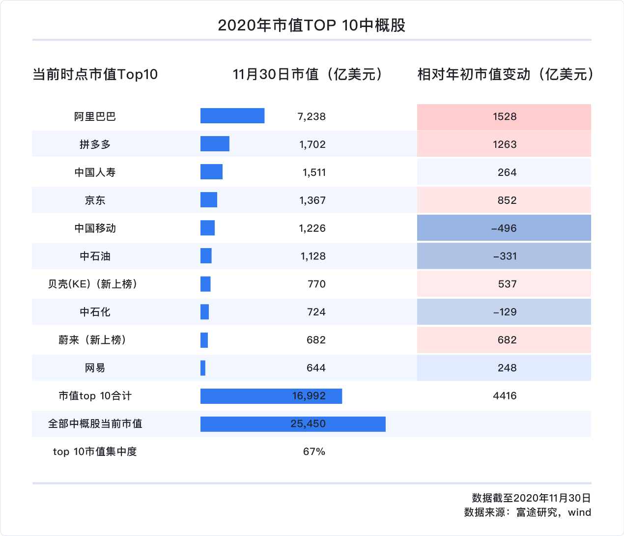 前十大中概股的合計市值高達1.7萬億美元,佔中概板塊總市值的比重為67%,相對於今年1月1日的前十大中概股的市值增幅為26%,貝殼、蔚來成為新上榜公司,中海油、百度則退出前十。
