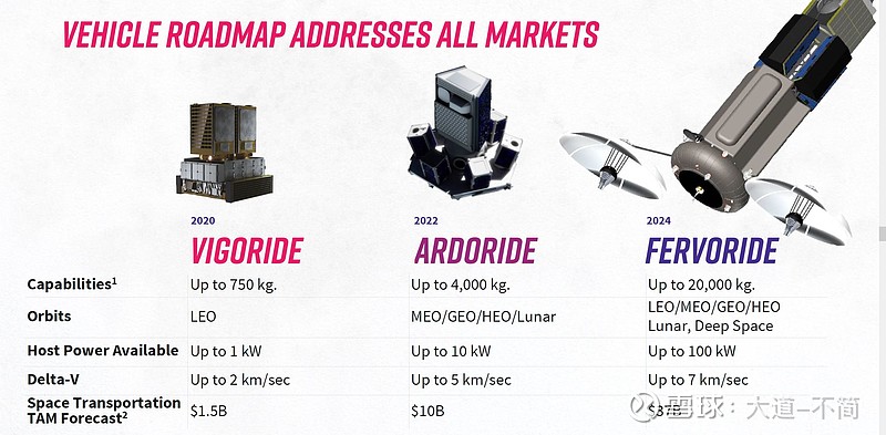 先看看Momentus的3個太空運輸車,第一個Vigoride,是最小型號的,主要是近地軌道運輸業務,就是把衛星從火箭脫離之後運輸到指定的近地軌道。第二個是Ardoride,可以把更重的衛星運輸到月球軌道了,第三個是FervoRide,可以把髮型負荷送到深空。