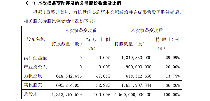 通過股權穿透,吉利將成為力帆的實際控制人。公告顯示,權益變更完成後,滿江紅基金、產業投資人將分別佔上市公司總股本的29.99%、20%。