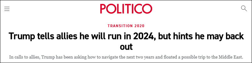 報導援引多名知情人士的話說,特朗普在幾天內給十幾個盟友打了電話,向他們諮詢自己未來兩年需要做些什麼,才能“參與到對話中來”。有知情人士透露,雖然特朗普告訴盟友,他計劃再次競選總統,但特朗普也表示,如果他認定自己很難獲勝,便可能會在兩年內退出。