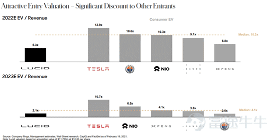 不過由於3月15日對應殼公司CCIV最新股價為26.77美元,隱含Lucid合併後市值已高達428億美元。