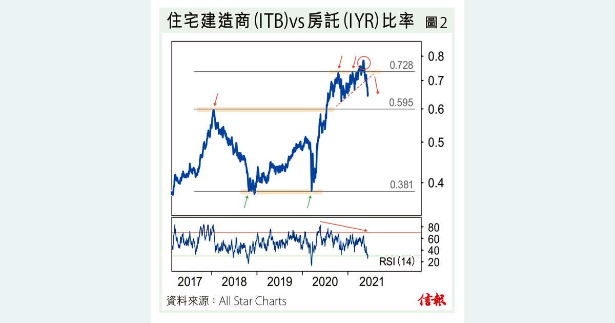 銅金比率及債市以外,另一個指標亦值得注意,那就是美國住宅建造商股價相對房託(REITs)走勢。與銅金比率一樣,建造商ETF(ITB)vs房託ETF(IYR)對息口去向也具啟示作用,比率愈高意味投資者對經濟復甦反應愈正面,基本上也解釋了新冠疫潮爆發以來建造商何以大部分時間跑贏房託。然而,近期情況有變,ITB相對IYR非但腳軟掉頭,且失守過去數月形成的上升趨勢線,與房託顯已風水輪流轉【圖2】。