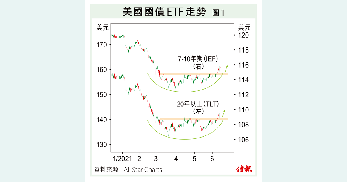 證諸追蹤美國國債價格的ETF,不管七至十年期(IEF)抑或二十年以上(TLT),都在「債牛」已死之說充斥媒體時找到支持,且不約而同營造大圓底,近日終於突破阻力雙雙爆上【圖1】,押重注通脹惡化之輩,眼鏡早已碎滿一地。