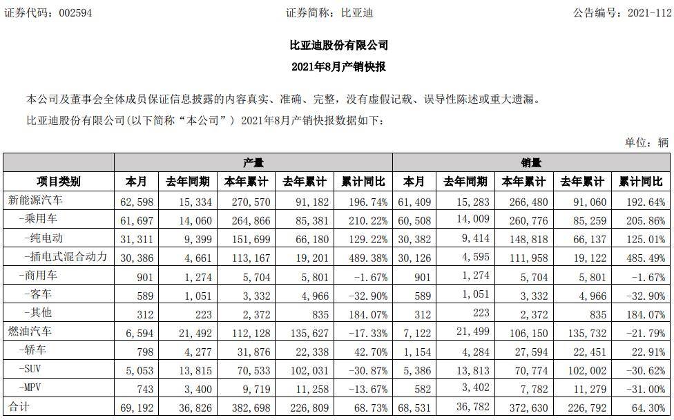 9月3日晚間,比亞迪(002594)發佈公告稱,公司1-8月新能源汽車銷量266,480輛,同比增長192.64%。其中8月新能源汽車銷量61,409輛,上年同期為15,283輛,估算同比增長302%。