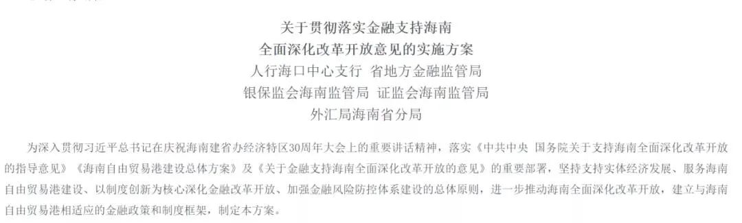 2021年4月,中國人民銀行、銀保監會、證監會、外匯局發布《關於金融支持海南全面深化改革開放的意見》,提出33條金融支持海南全面深化改革開放的具體措施。