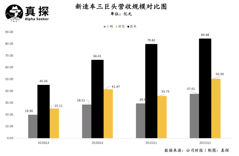2021年二季度蔚來一家的營收幾乎等於理想加小鵬的營收,蔚來規模之“大”,可見一斑。