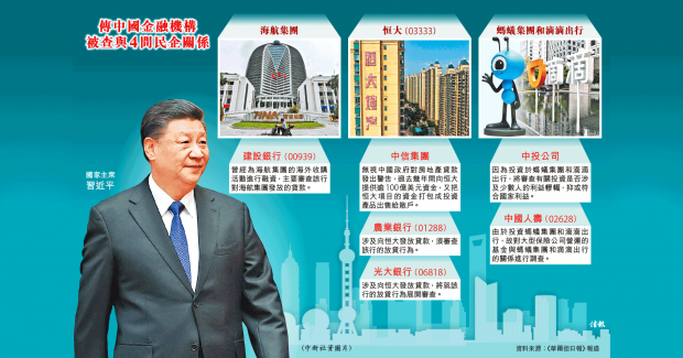 中央紀律檢查委員會一連兩日高調宣布巡視多間大型金融機構和金融監管機構,似在顯示中國規模空前的監管風暴,下一階段目標可能是金融行業。《華爾街日報》昨天報道,國家主席習近平已下達指令,由中國最高級別的反貪腐機構中紀委國家監委,全面審查國有金融機構與大型民企的關係,調查對象涉及25間金融機構,包括建設銀行(00939)和農業銀行(01288)兩大國有商業銀行。
