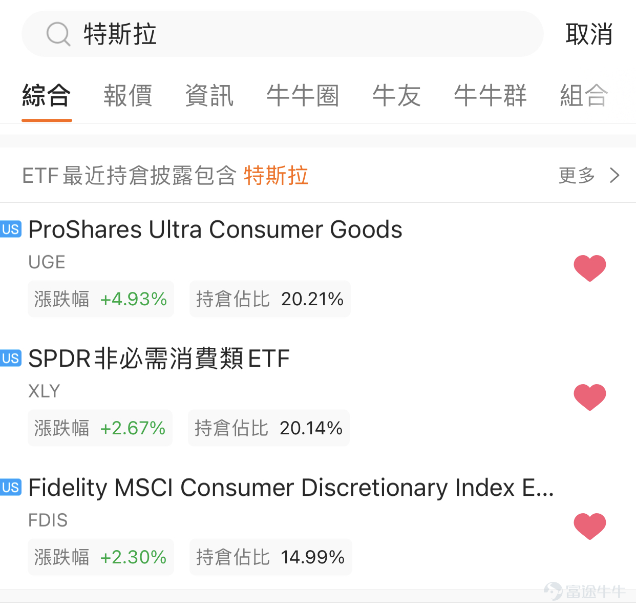 通過在牛牛中搜索特斯拉,你可以找到持有特斯拉佔比前三的ETF標的,讓有經驗的投資機構助力你一起“上車“特斯拉!