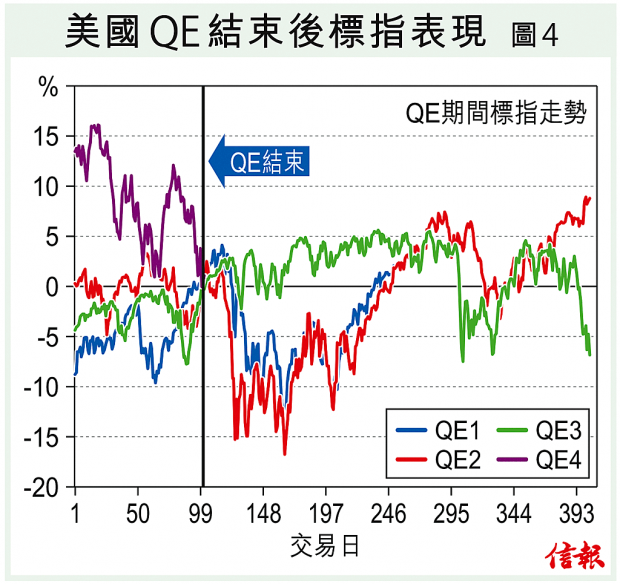 那麼,聯儲局縮表對股市帶來的衝擊又如何呢?從2008年金融海嘯後至今,每次聯儲局結束QE後,在隨後300個交易日(或啟動新一輪QE前,以較先者為準),股市表現傾向較疲弱,跌幅往往亦可達一成以上,如QE1和QE2。縱使沒有出現明顯的回吐(如QE3),但美股期內最大升幅亦只有5%左右而已【圖4】。