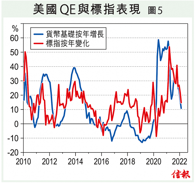 換言之,聯儲局短期內結束QE開始退市後(事實上,近日聯儲局資產規模已呈見頂跡象),若然退市再加上主動減持國債,可以預期美國流動性將顯著收縮,亦即銀根收緊或貨幣供應減少,市場息率抽升,勢將對美股構成壓力,尤其以增長股為主的納指,這某程度上也可解釋,為何美國貨幣基礎按年增速與標指變化關係密切【圖5】。