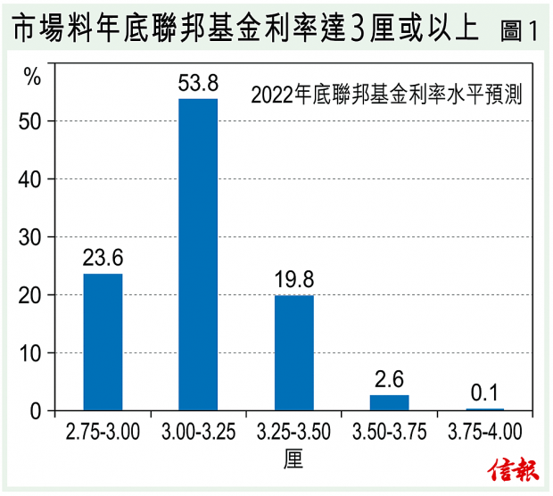 按目前利率期貨顯示,到今年底聯邦基金利率區間上調至3厘或以上的機率已接近百分百【圖1】,即今年隨後時間可能還有2厘的加息空間。