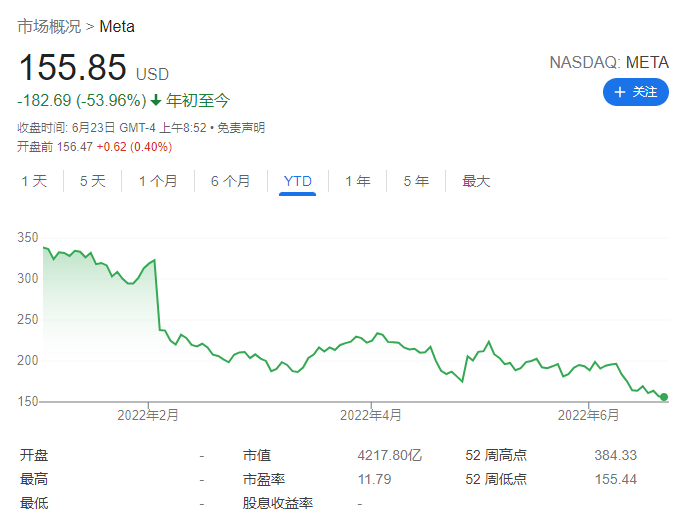 今年以來,社交媒體巨頭Meta的股價已暴跌超50%。該公司還警告稱,經歷長達十年的迅猛增長後,營收或將迎來下滑。FactSet 數據顯示,基於2023業績預期估計的Meta遠期市盈率已降至12.2,低於標普指數的15.85。