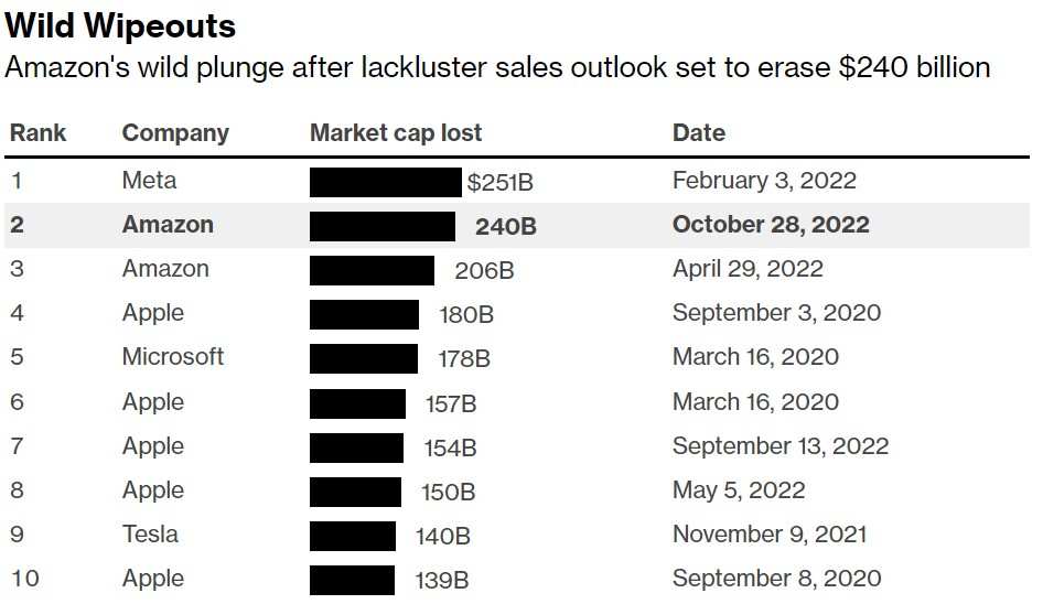 如果亞馬遜盤後下跌反映在週五的交易中,這將相當於約2400億美元市值的損失——這將是該股自2006年以來的最大跌幅。週四收盤時,亞馬遜的市值為1.13萬億美元。這將是今年最新一家市值暴跌的美國公司。