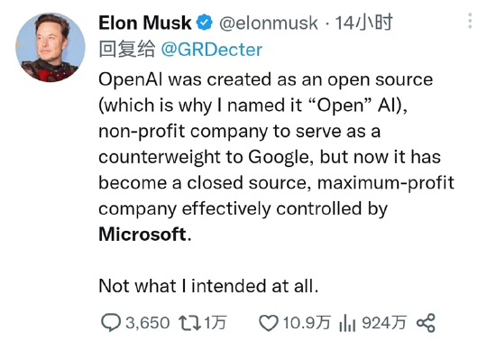 馬斯克在推特上批過OpenAI,說它當時是作爲一家開源、非盈利公司創建的,所以名字裏面才帶“Open”,目標就是制衡谷歌。但現在卻變成了一家微軟控制的閉源、追求利潤最大化的公司,這與馬斯克的初衷背道而馳。他還補充道:“我還捐了1億美元呢。”