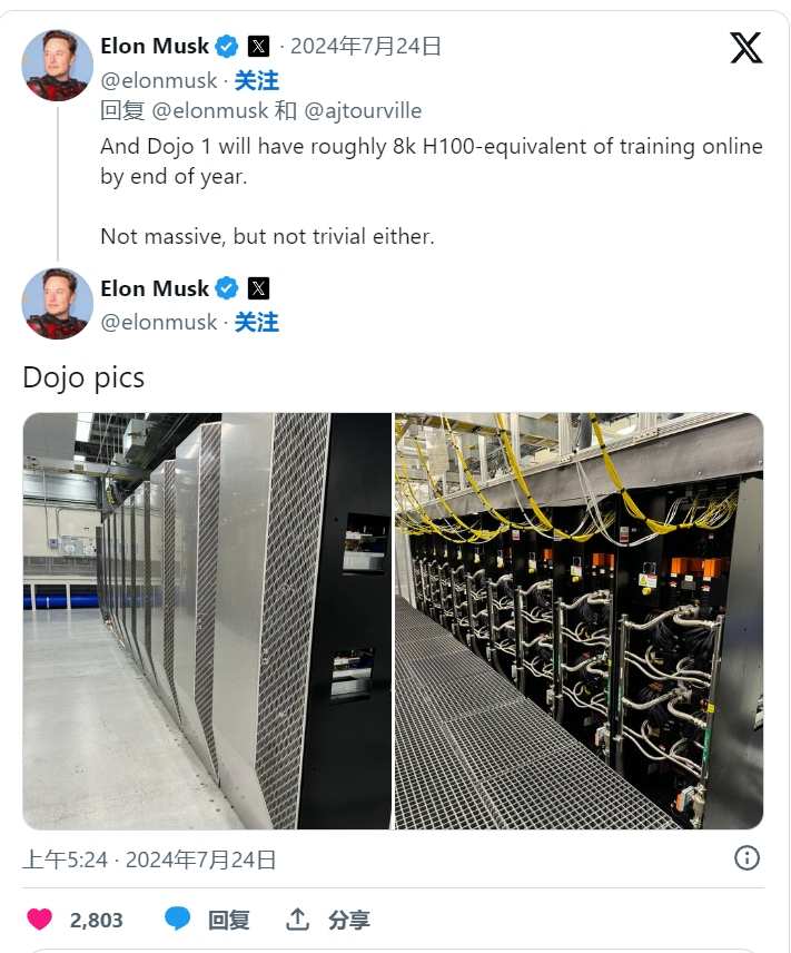 當天早些時候,馬斯克在推特上寫道:“到今年年底,Dojo 1號將提供相當於大約8000個H100的線上訓練量。不是很大,但也不是微不足道。”